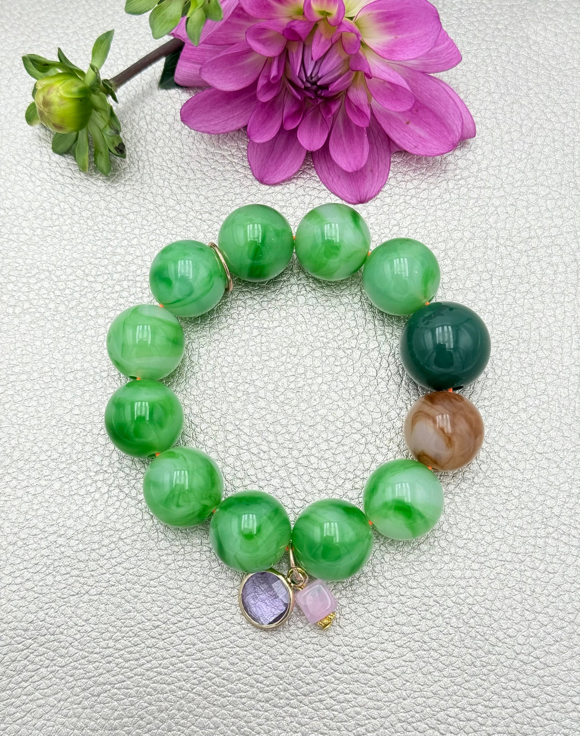 - Material: Gummikordel, Acryl-Kugeln, Messing-Ring, Anhänger aus natürlichem Stein