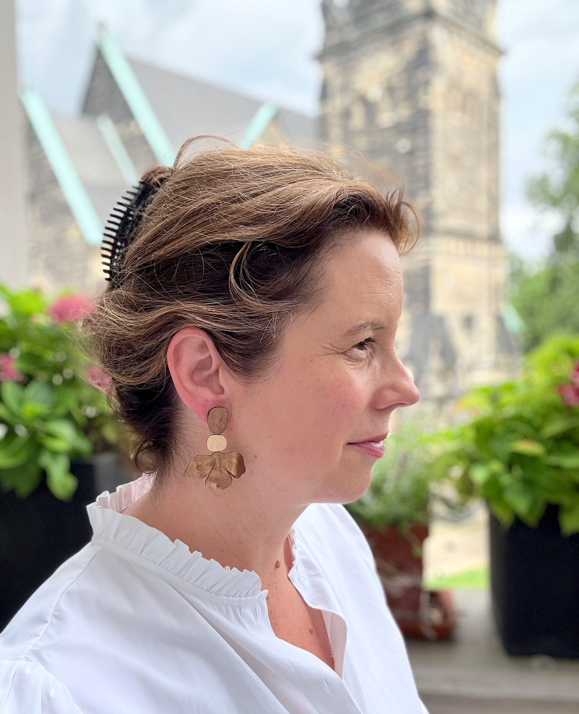 Leichte Ohrringe in Form einer Blüte aus schimmerndem feinen Leder in Gold- Bronzetönen