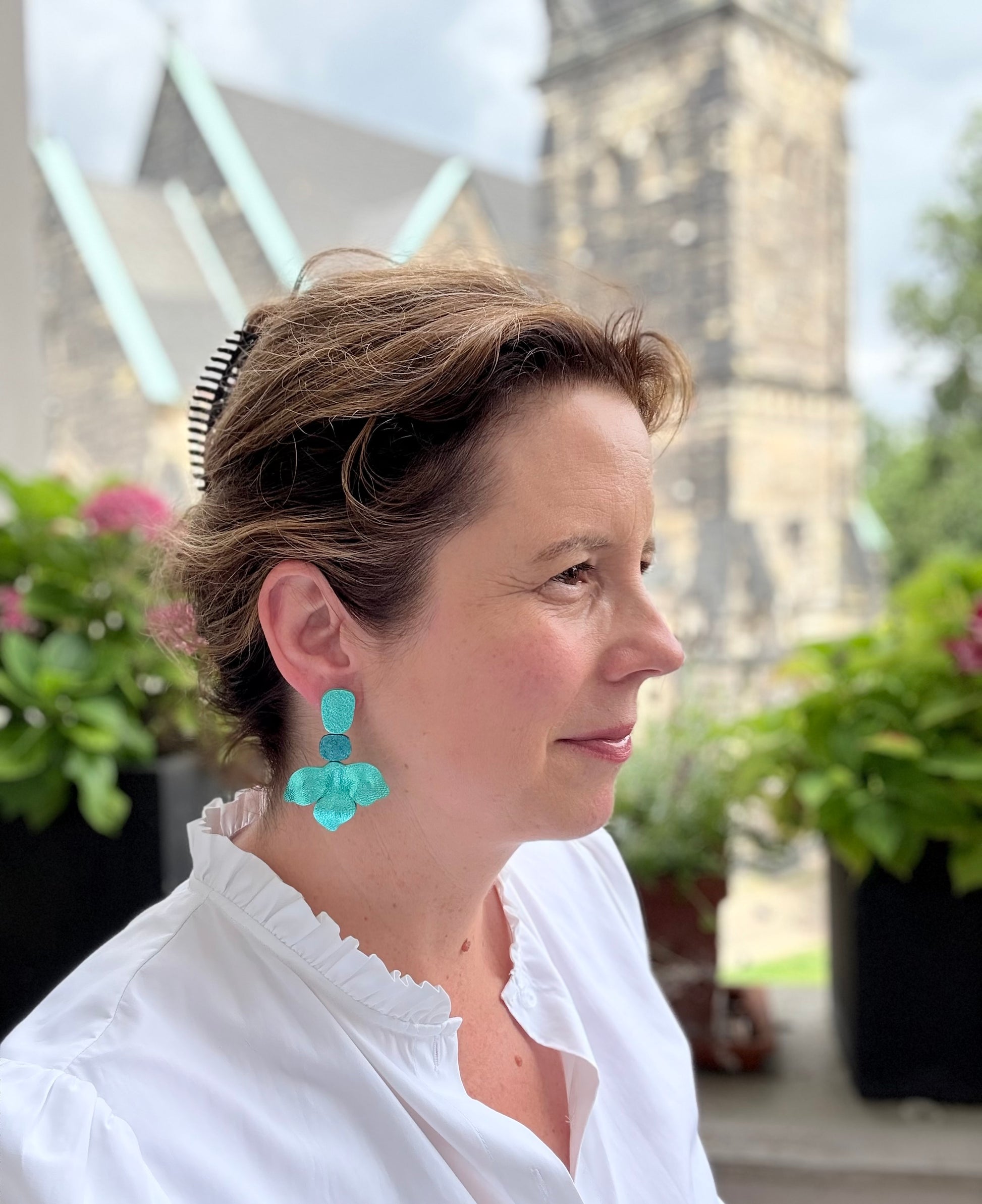 In liebevoller Handarbeit werden die hochwertigen Ohrringe in Griechenland aus feinstem Leder gefertigt. Die türkis schimmernde Oberfläche des weichen Leders sieht elegant und exquisit aus. Mit diesen außergewöhnlichen Blüten-Ohrringen setzt du echte Wow-Akzente bei deinem Outfit. Unsere neuen Lieblinge 🌟