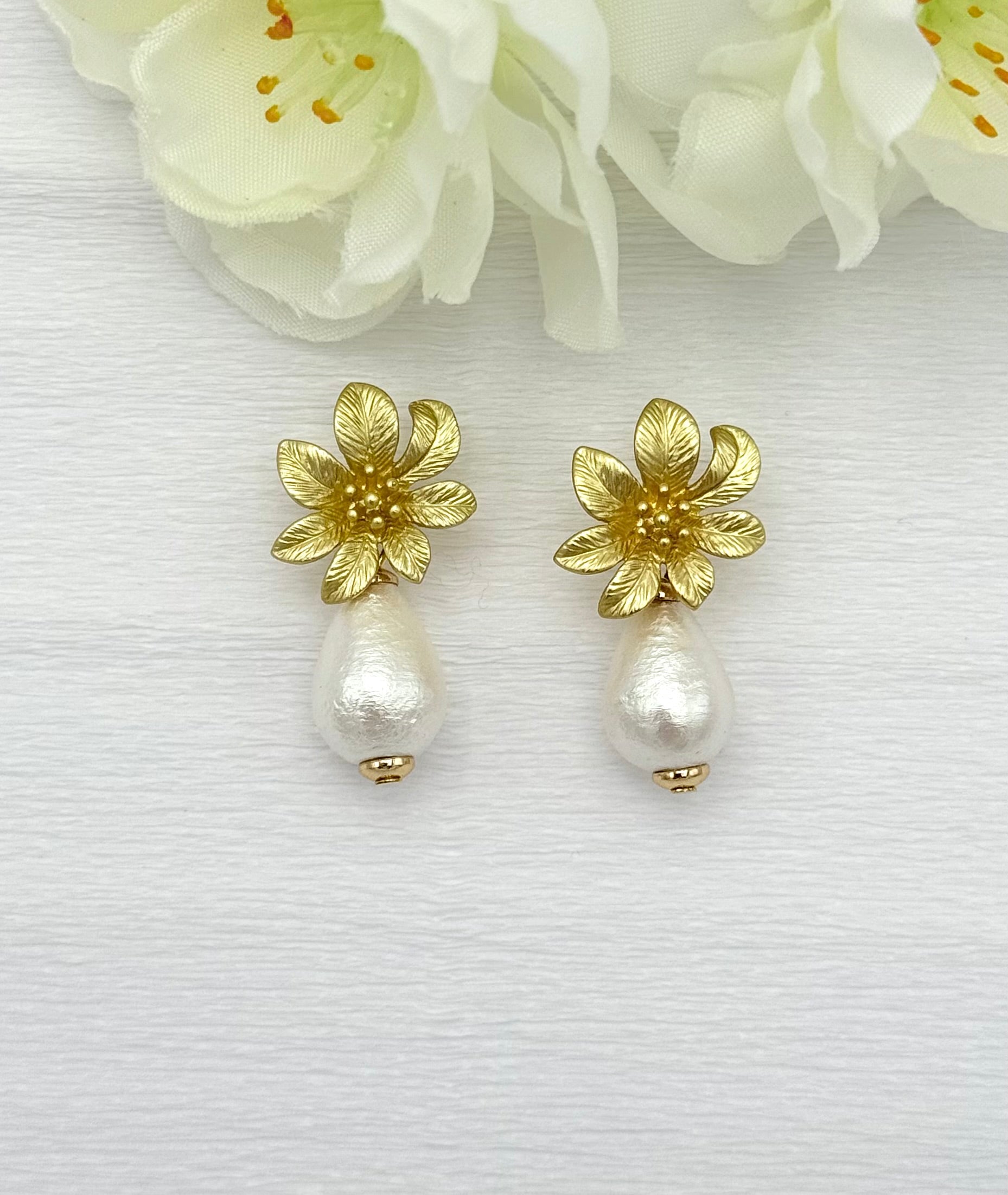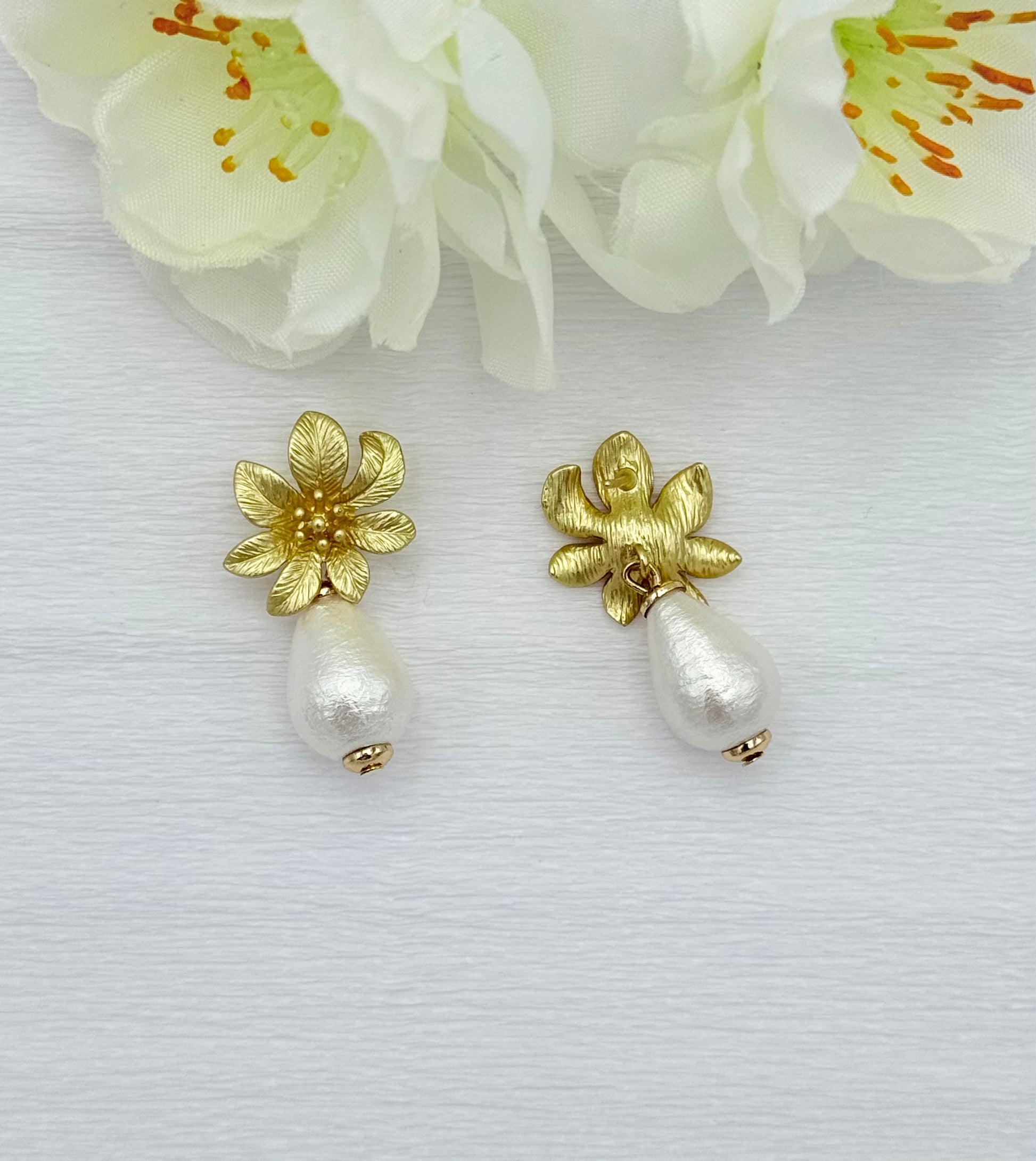 Goldene Blütenohrringe mit kleiner leichter Baumwollperle