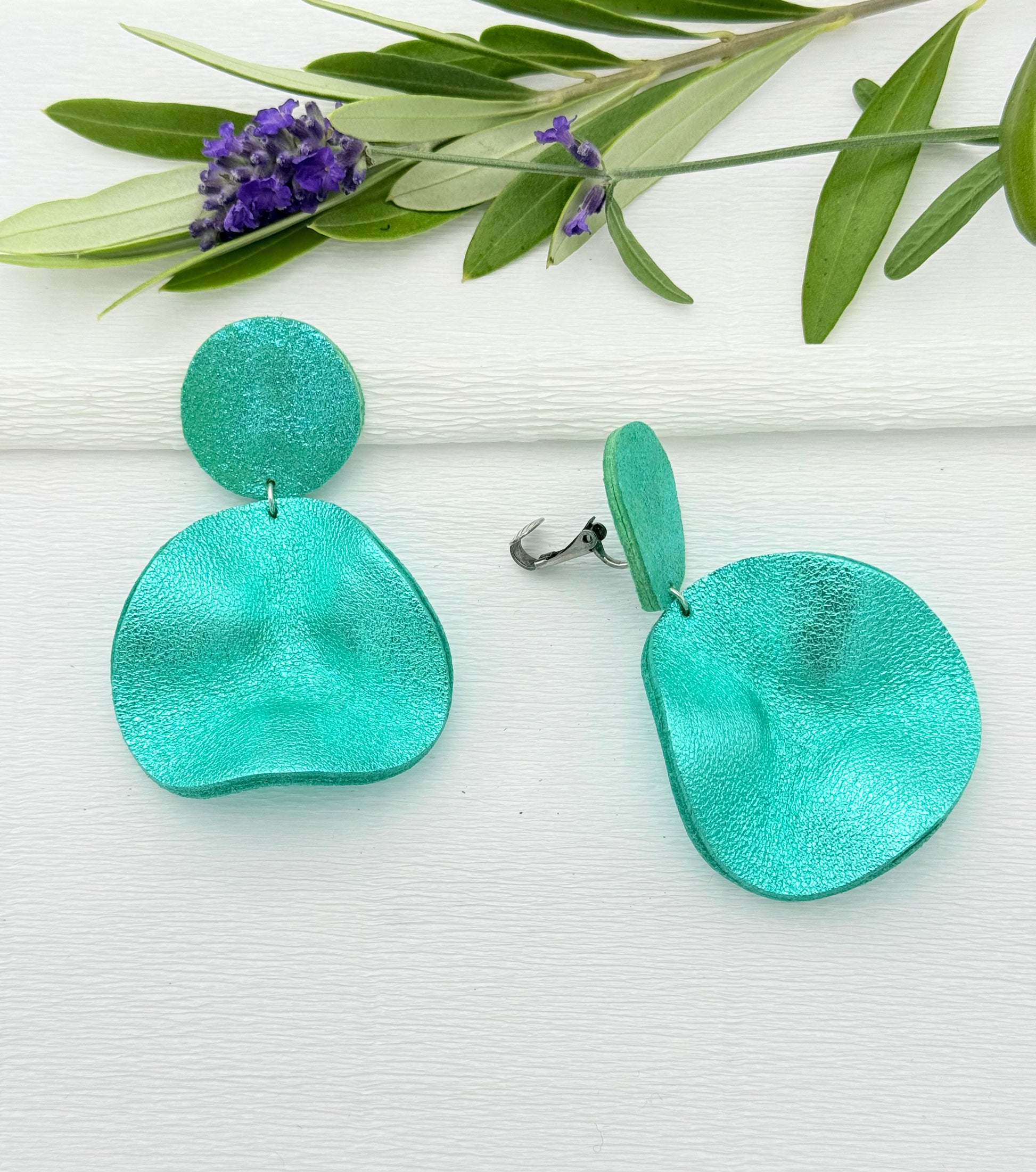 Diese super leichten Clips-Ohrringe sind absolute Lieblinge. Wunderschön schillernde Farben - federleicht am Ohr, großer wellenförmiger Anhänger in einem glänzendem Türkis. Handgefertigt in Griechenland aus feinstem Leder.