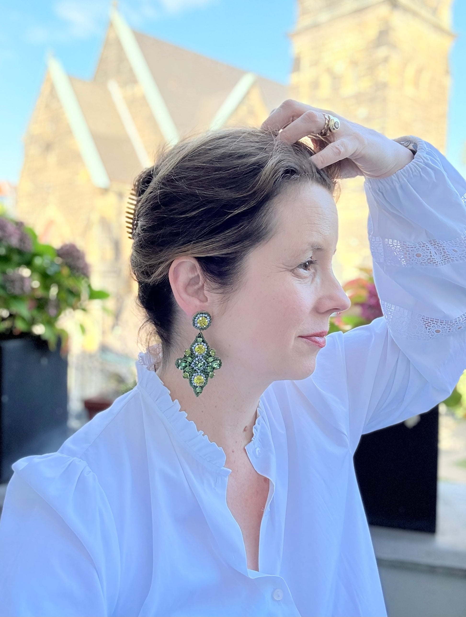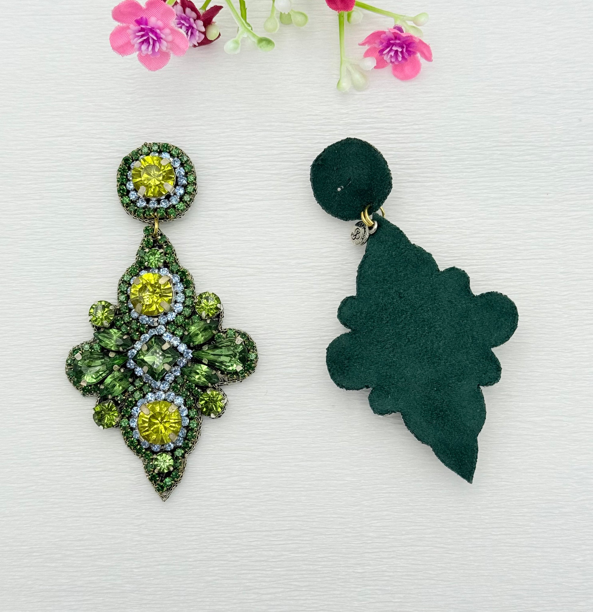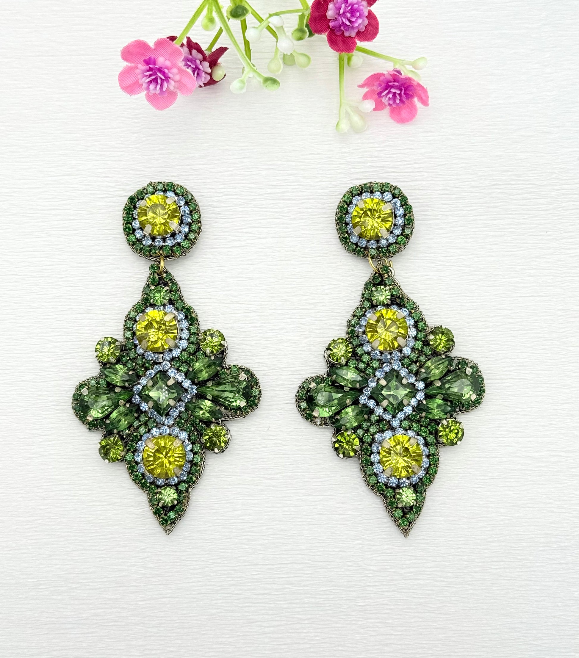 Tauche ein in die farbenfrohe Welt Indiens mit unseren einzigartigen leichten Ohrringen. In einer kleinen familiengeführten Manufaktur entstehen diese kunstvollen Schmuckstücke in liebevoller Handarbeit aus kleinen Strass-Steinen, Glaskristallen und gehäkeltem Glitzerdraht. Die grünen Farbtöne setzen echte Highlights zu deinem Outfit und verleihen selbst klassischen Looks das gewisse Etwas. Diese wunderschönen, exklusiven Ohrringe sorgen dafür, dass dein Auftritt ganz besonders bleibt.