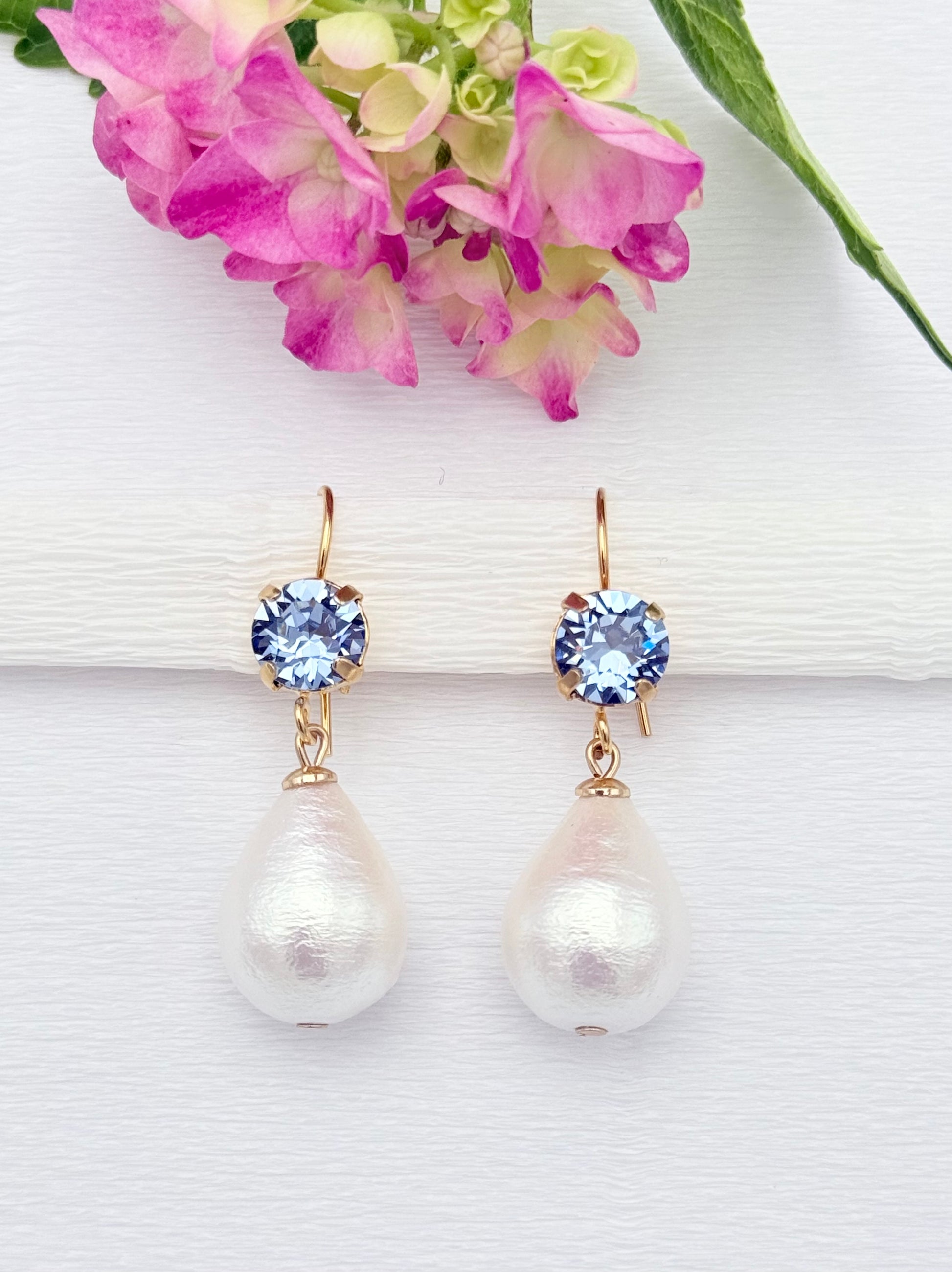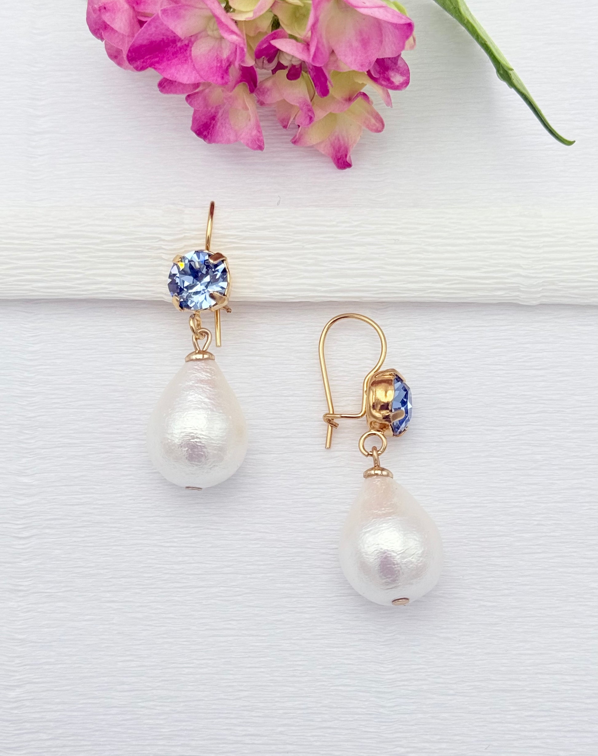 Unsere schönen Tropfen-Ohrringe mit den super leichten Baumwollperlen in klassischem Weiß sehen einfach wunderschön aus. Der edle PureCrystal Glaskristall in strahlendem Hellblau setzt farbig leuchtende Akzente und bringt den Ohrring wunderschön zum Strahlen.