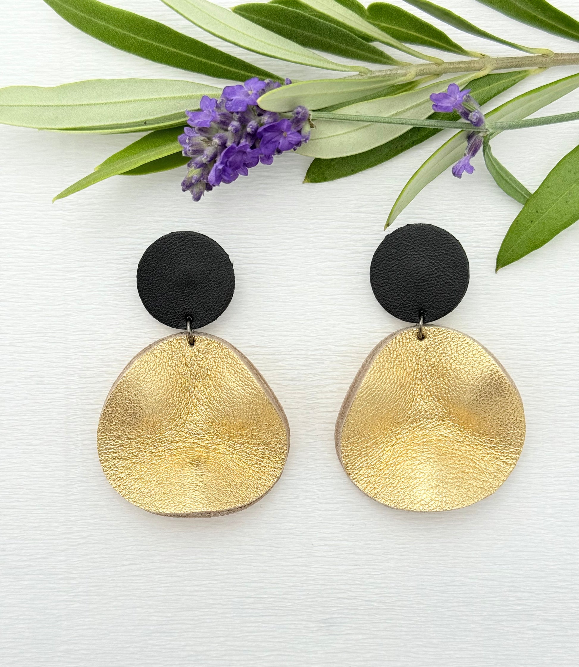 Goldene Ohrringe aus Leder mit einem kleinen gewellten Anhänger