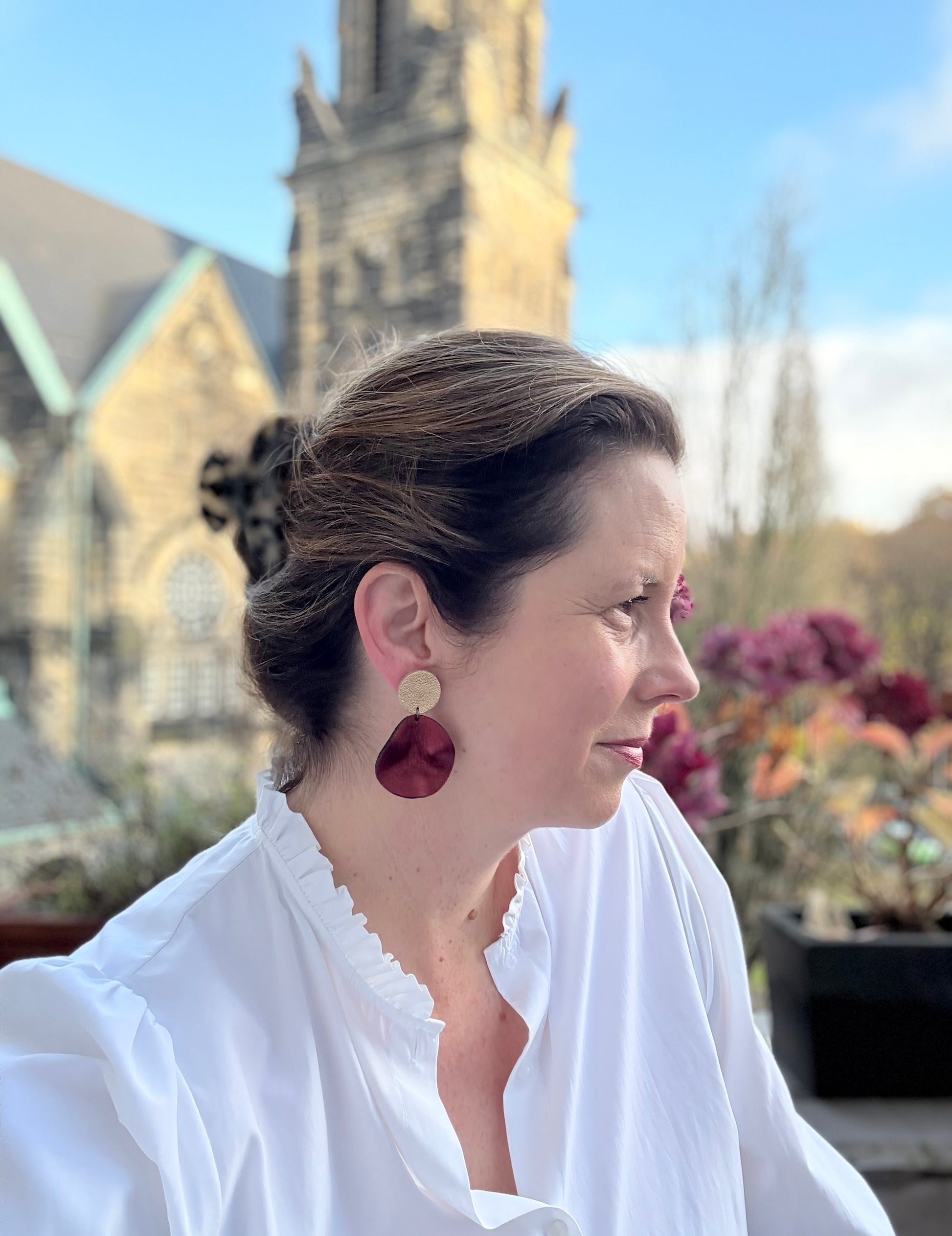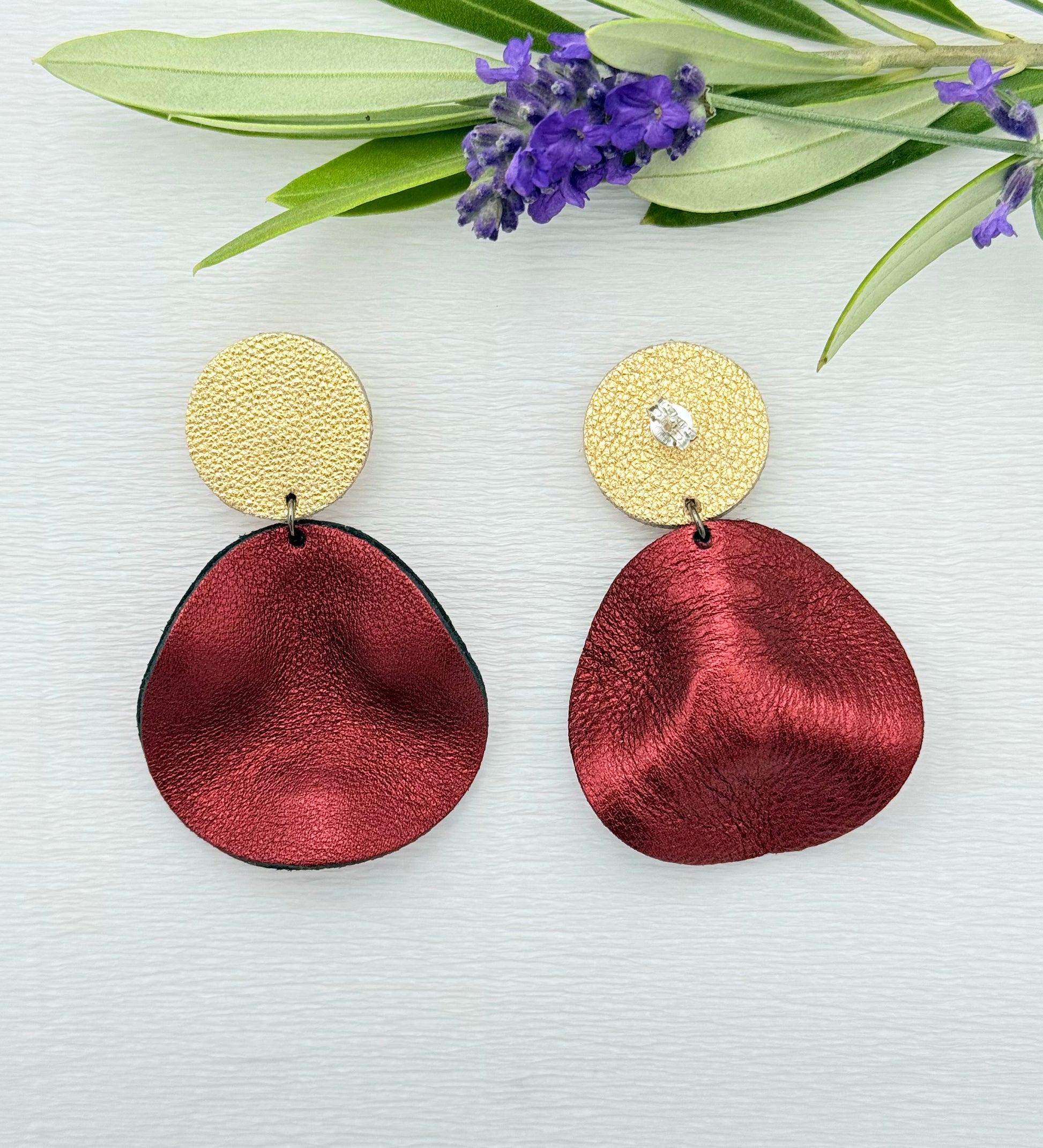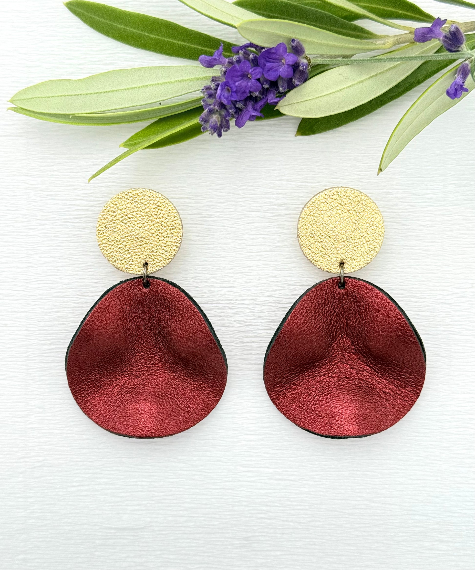 Bordeauxrote Ohrringe aus feinem Leder mit einem kleinen gewellten Anhänger