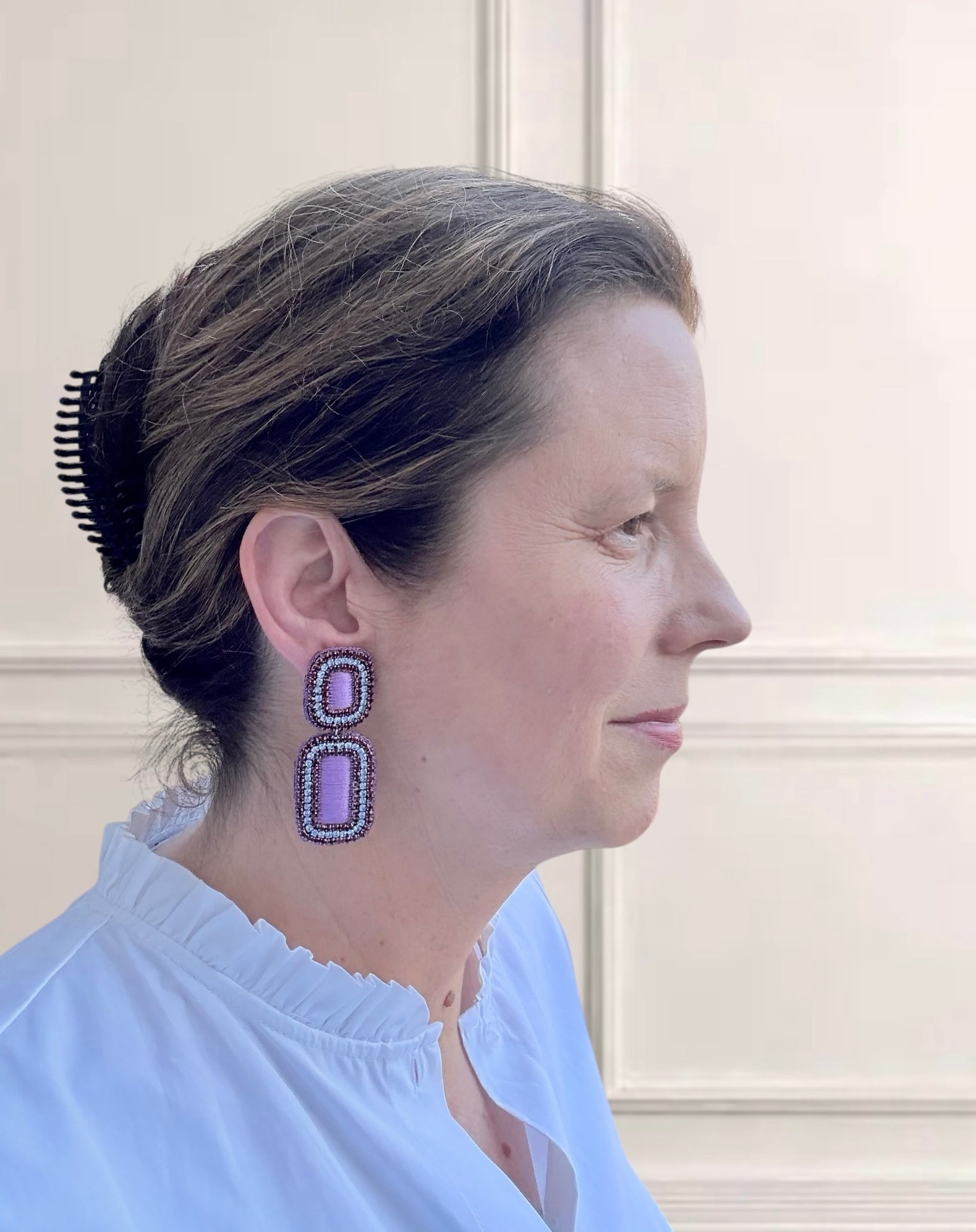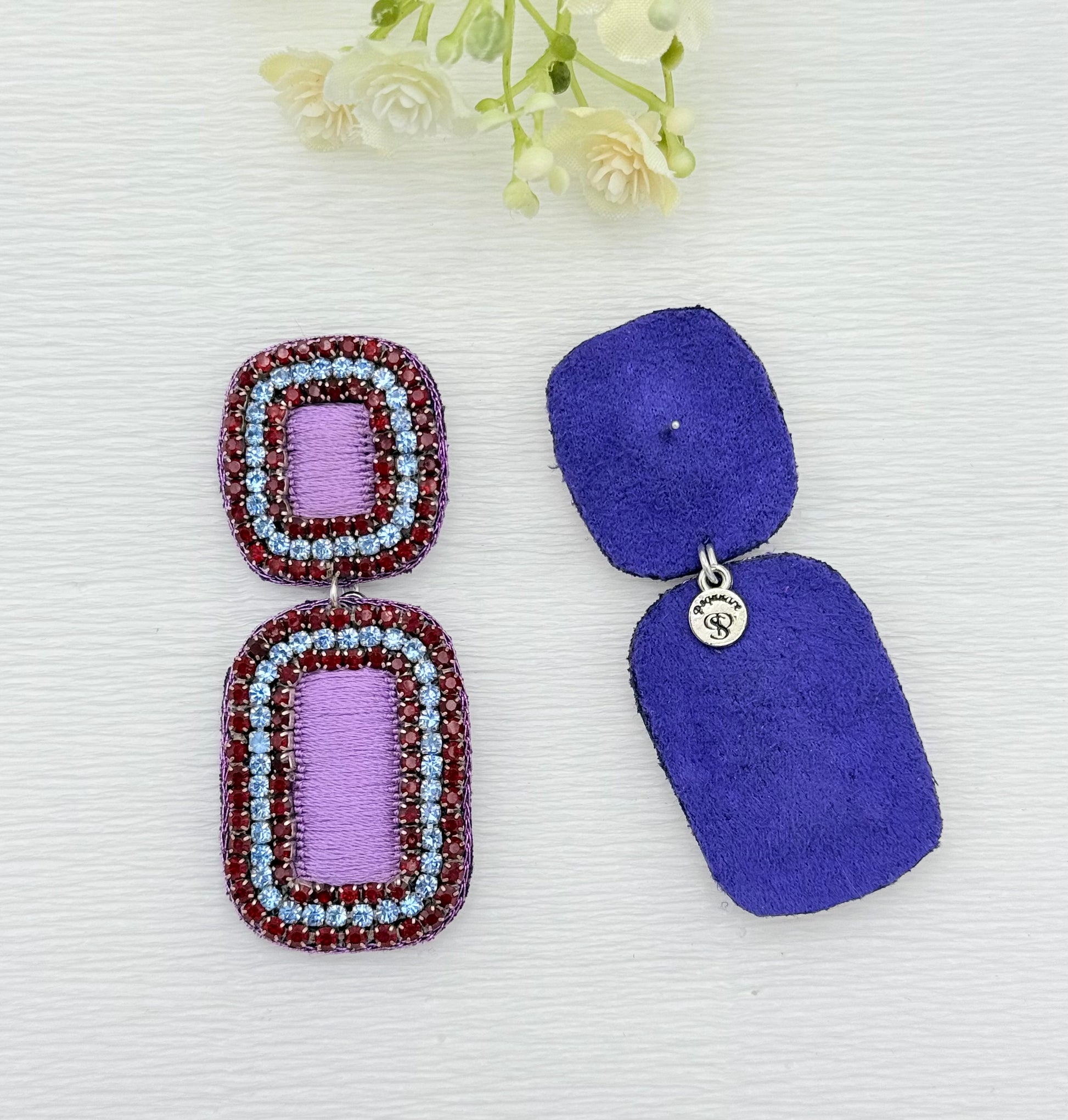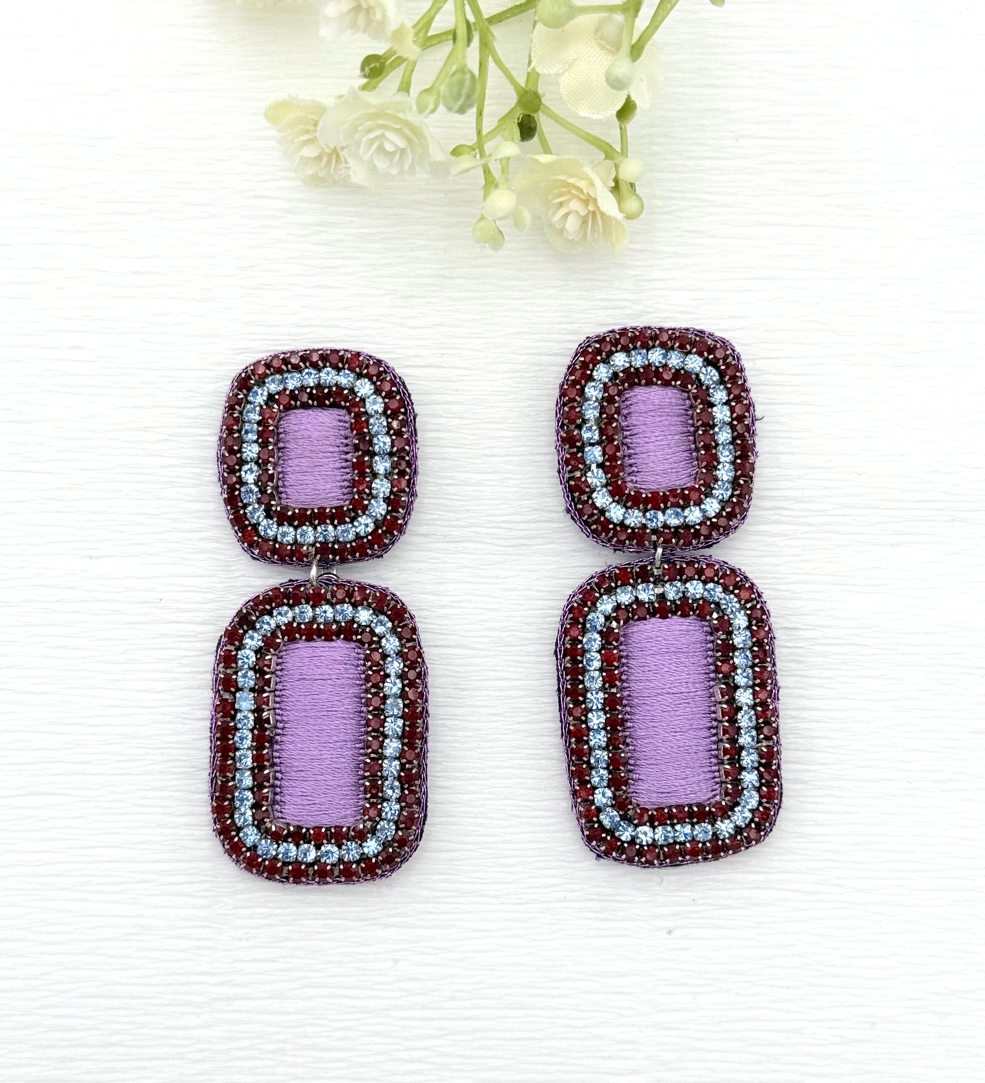 Handfertige Ohrringe aus indischer Seide in lila und hellblau