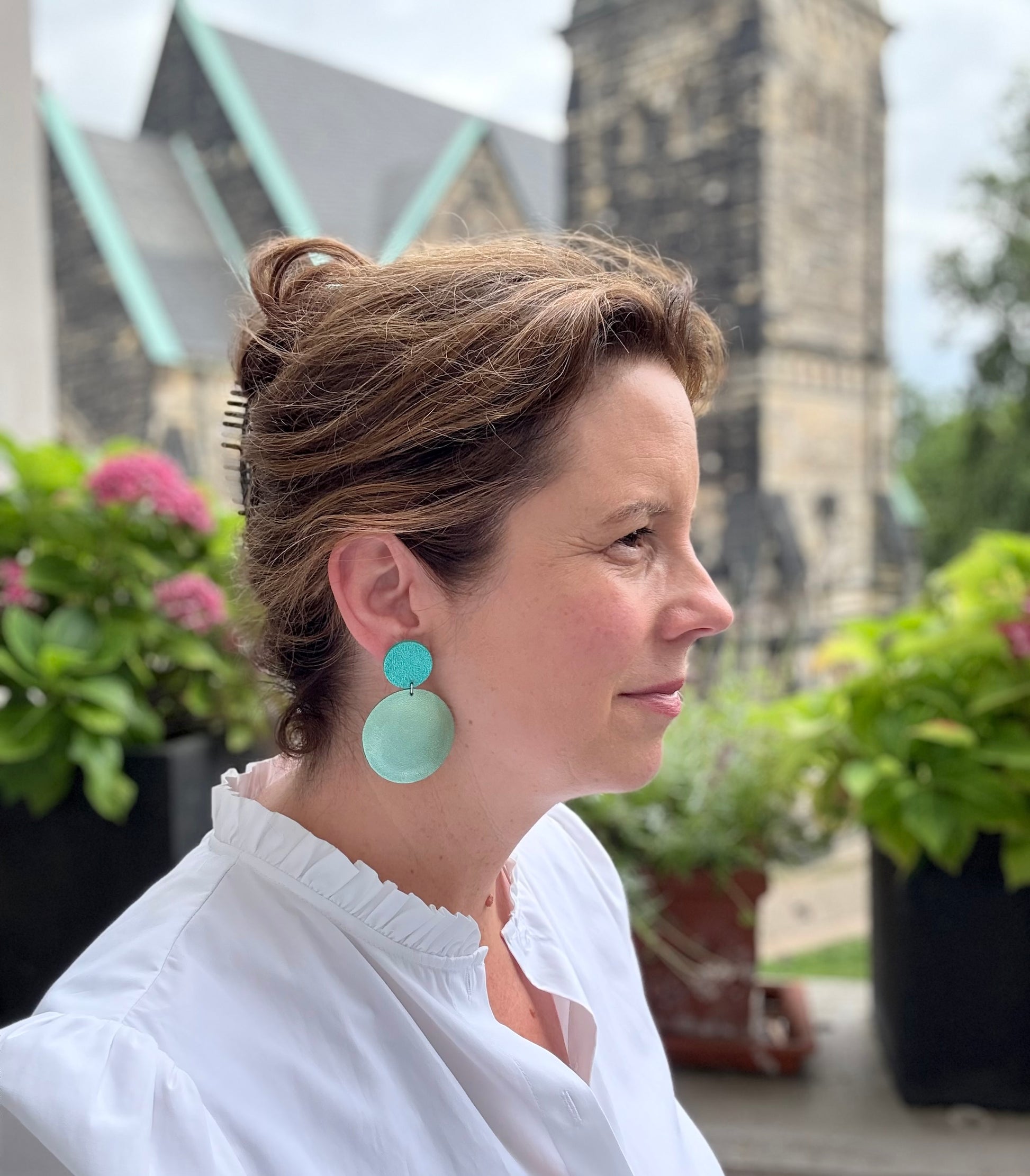 Wunderschön schimmernde Ohrringe aus edlem Leder mit einem runden Anhänger in glänzendem Lindgrün