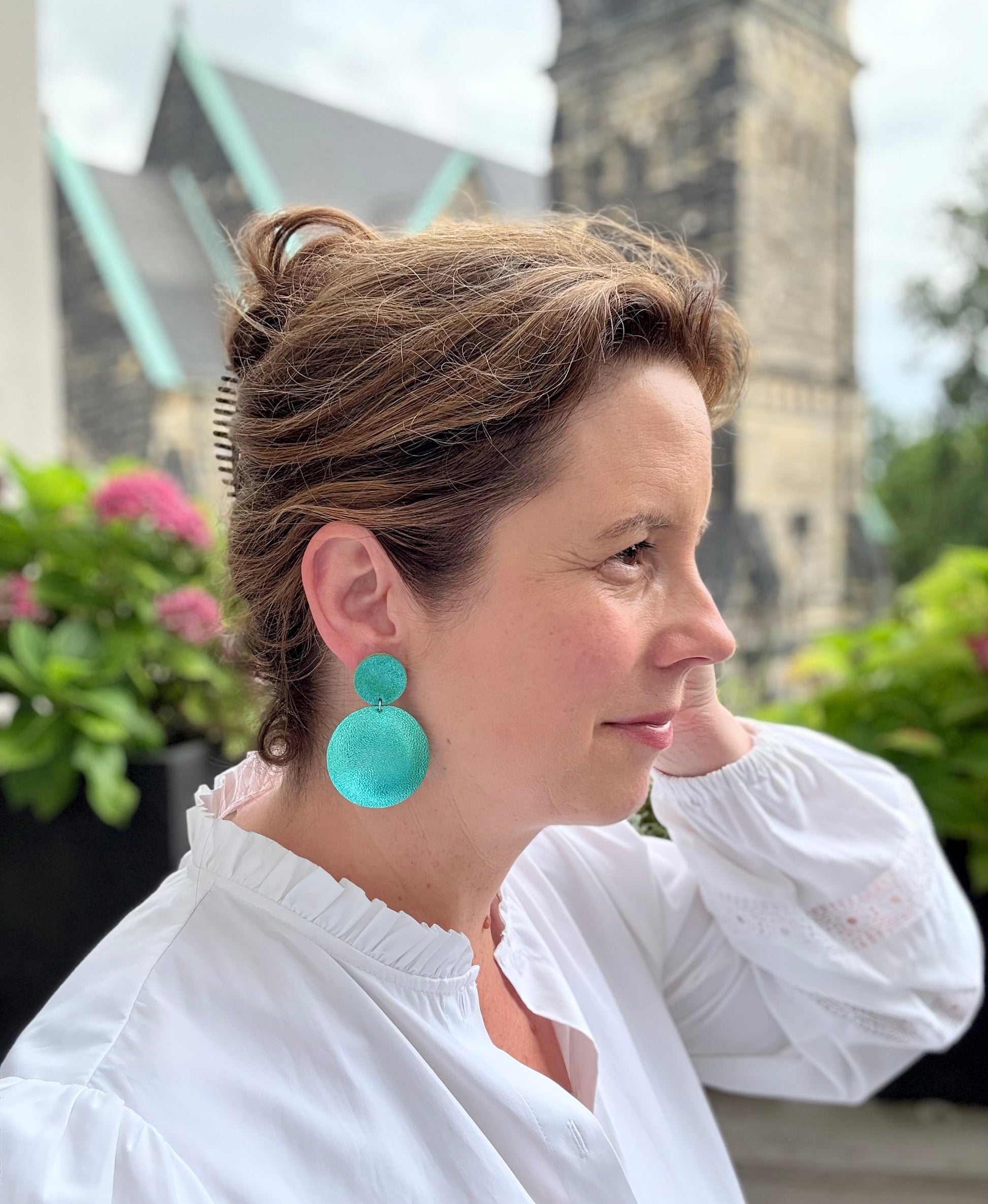 In liebevoller Handarbeit werden die hochwertigen Ohrringe in Griechenland aus feinstem Leder gefertigt. Die türkis schimmernde Oberfläche des weichen Leders sieht elegant und exquisit aus. Mit diesen außergewöhnlichen Ohrringen setzt du echte Wow-Akzente bei deinem Outfit. Unsere neuen Lieblinge 🌟
