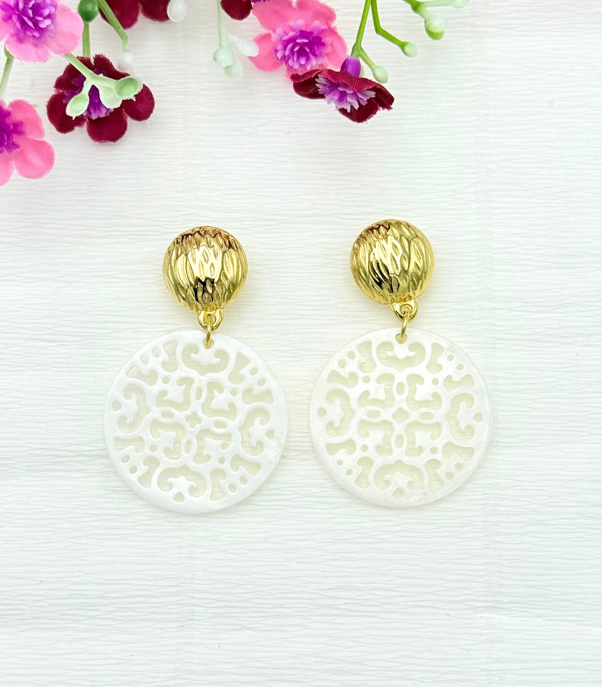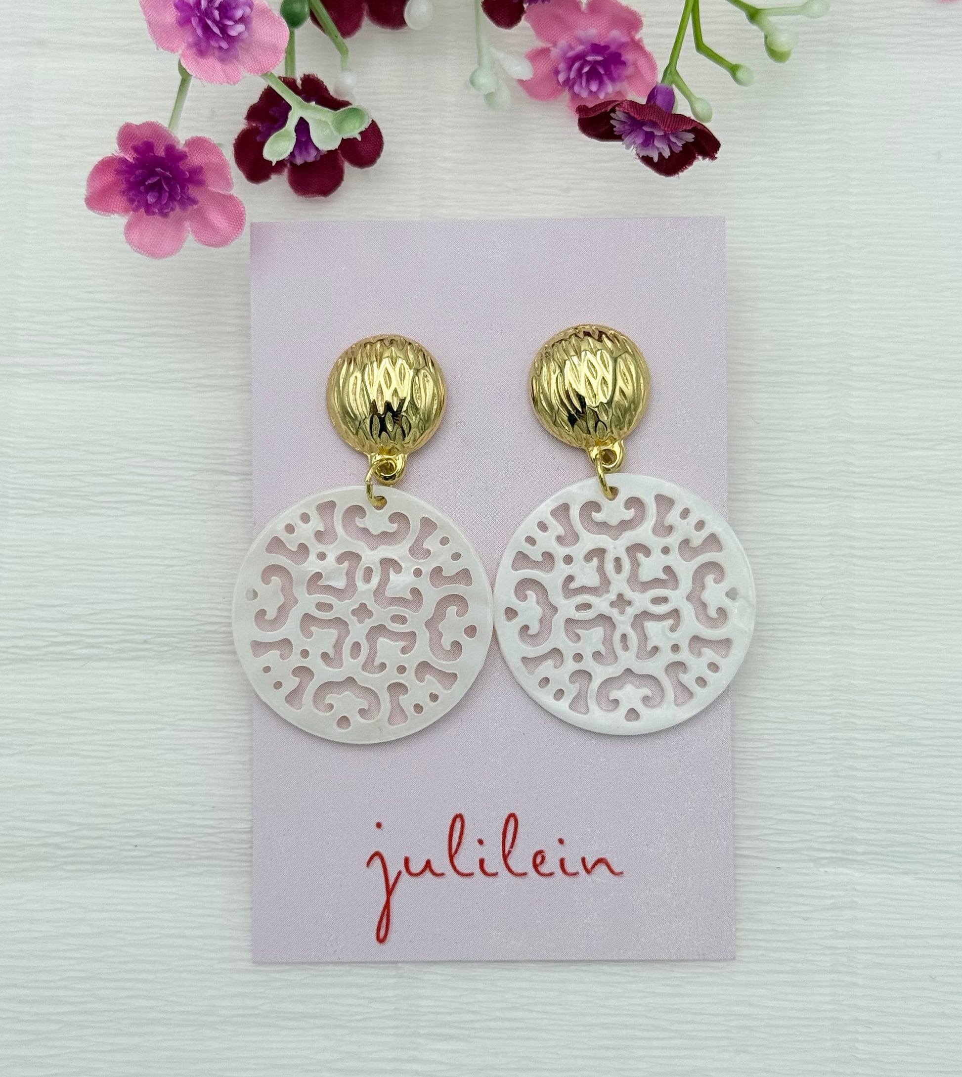 Diese neuen Ornament-Ohrringe sind absolute Klassiker. Der vergoldete Stecker sitzt wunderschön mittig am Ohrläppchen, der runde Perlmutt-Anhänger ist eine edle und schicke Ergänzung - diese schönen Ohrringe verleihen deinem Look eine natürliche Verspieltheit und Eleganz.