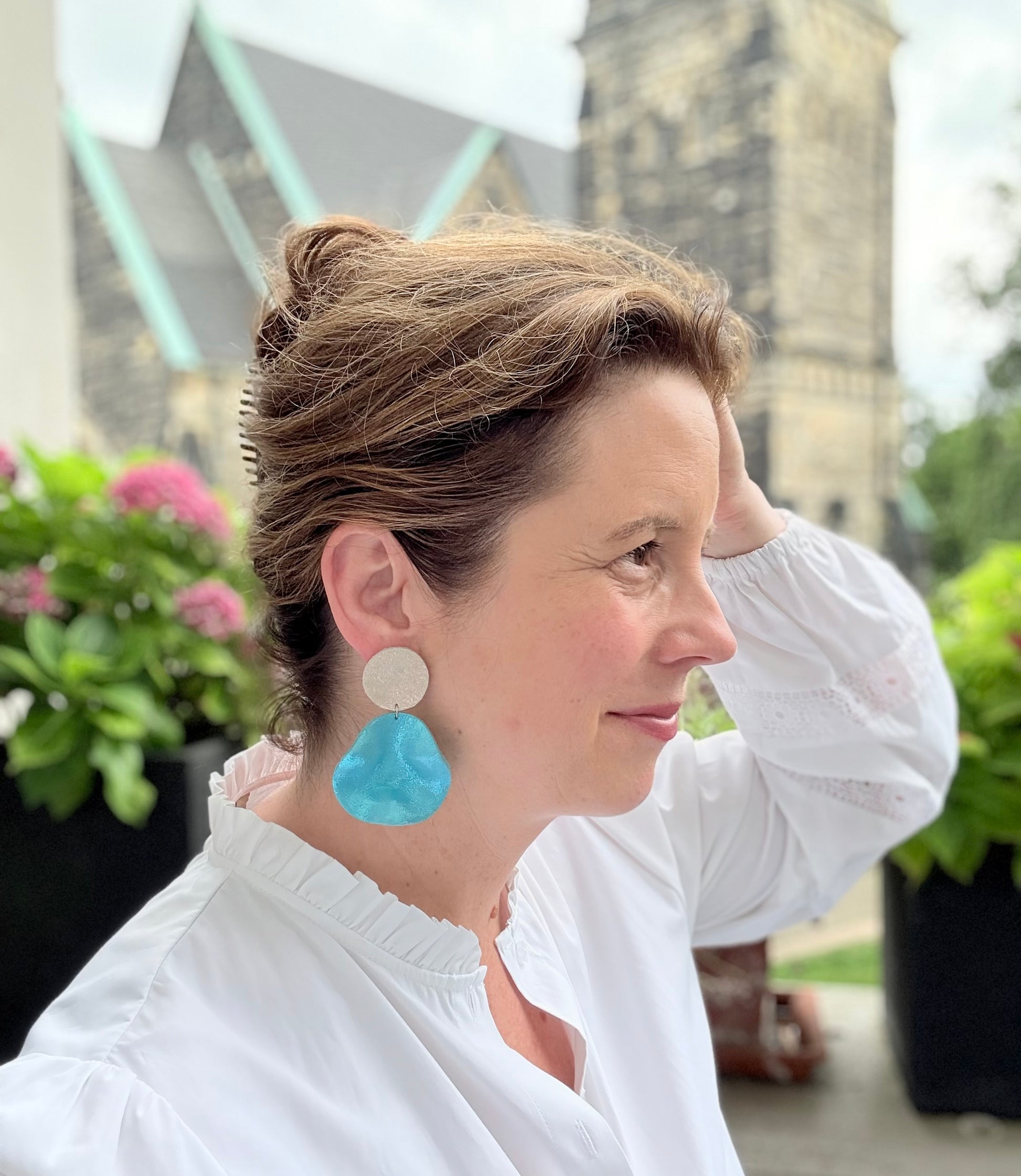 Die Ohrringe sind ganz leicht und können wunderbar den ganzen Tag getragen werden, durch den mittig platzierten Stecker (925er Sterling Silber) sitzen sie auch perfekt am Ohr.