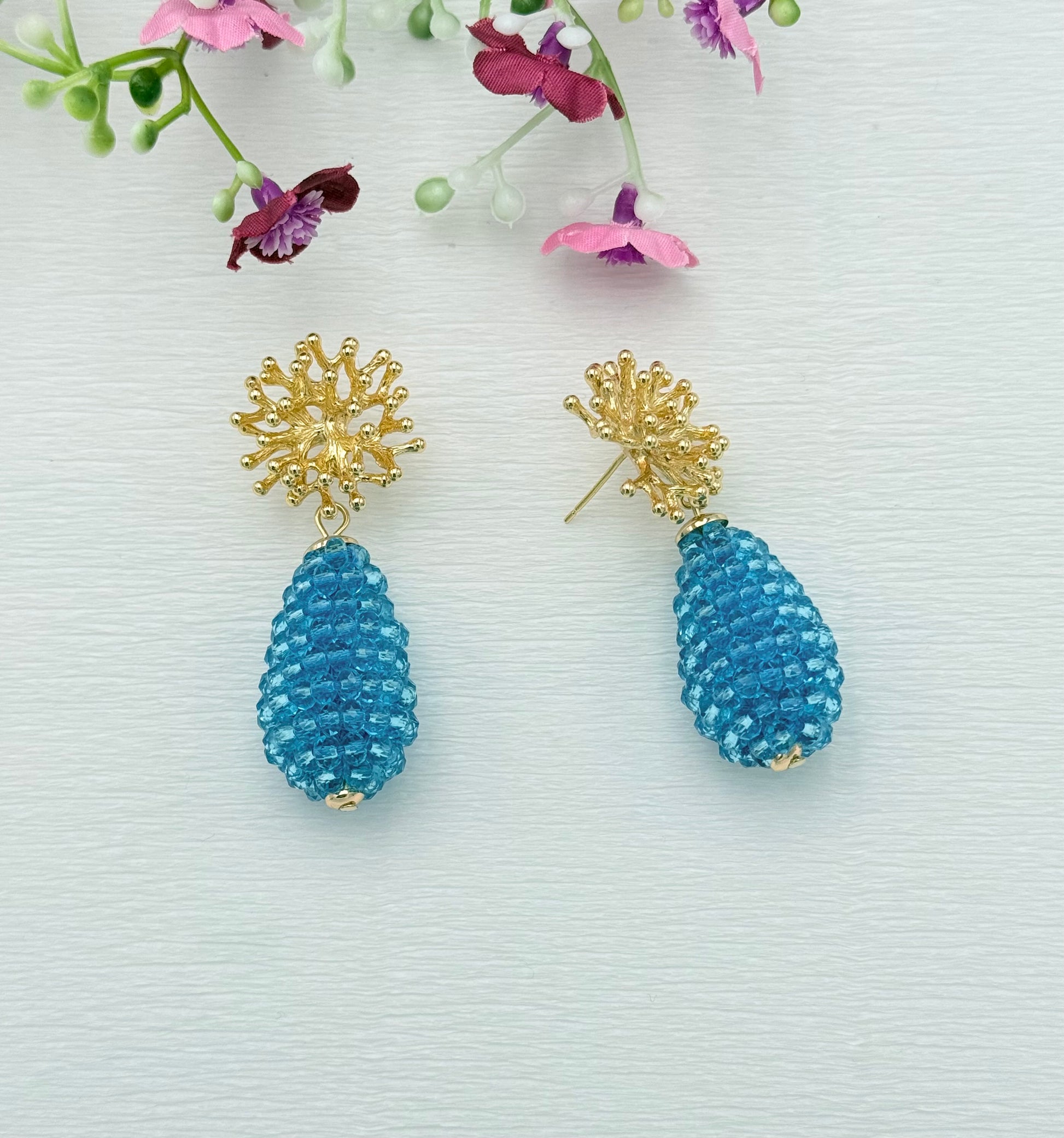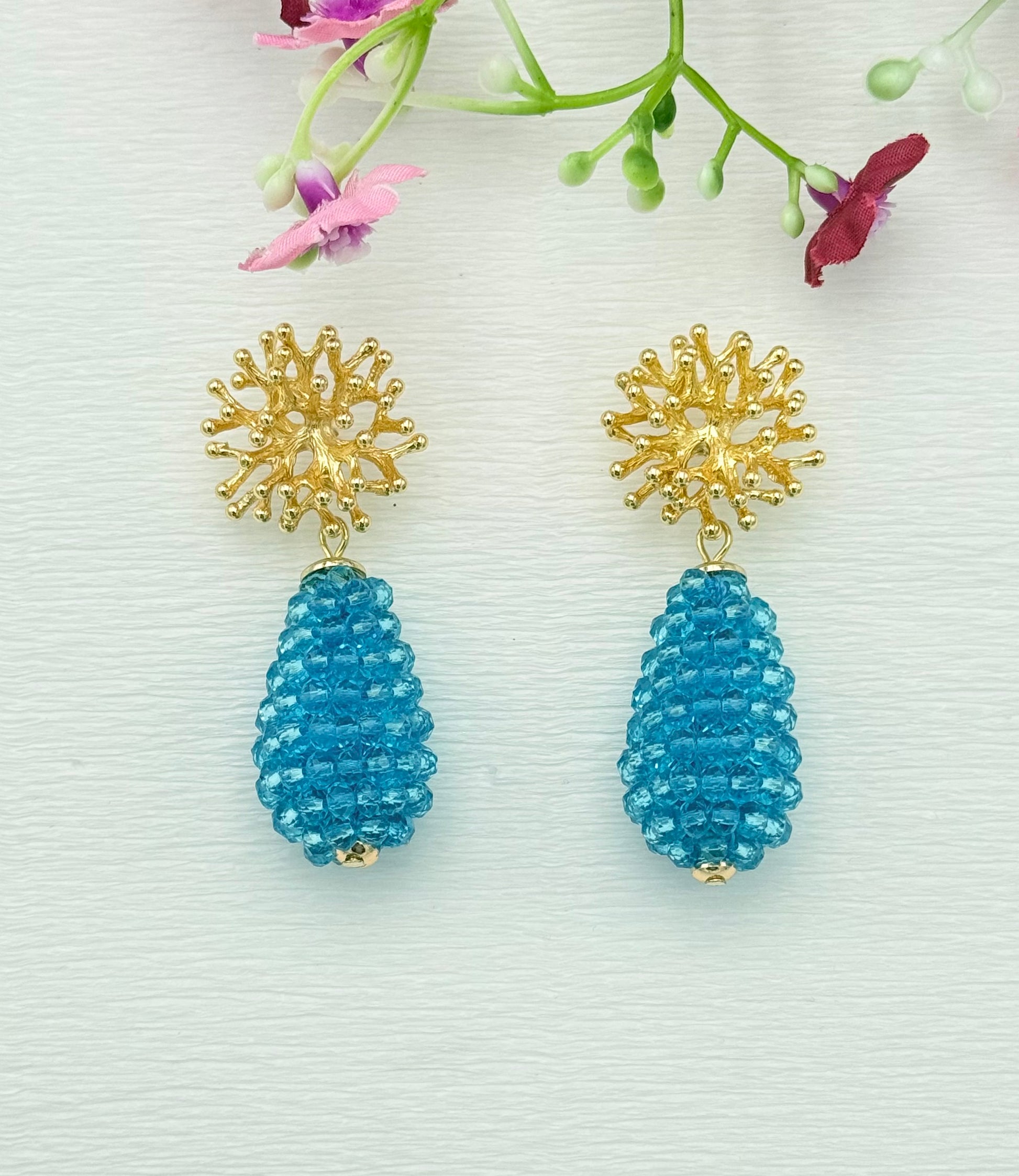 Schöne Ohrringe mit türkisem Glitzertropfen und Stecker in Korallenform