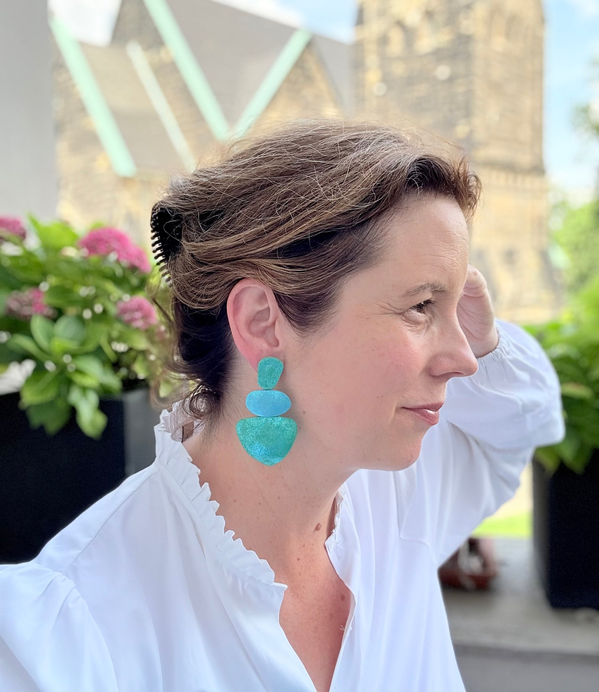 In liebevoller Handarbeit werden die hochwertigen Ohrringe in Griechenland aus feinstem Leder gefertigt. Die blau/türkis schimmernde Oberfläche des weichen Leders sieht elegant und exquisit aus. Mit diesen außergewöhnlichen Statement-Ohrringen setzt du echte Wow-Akzente bei deinem Outfit. Unsere neuen Lieblinge 🌟